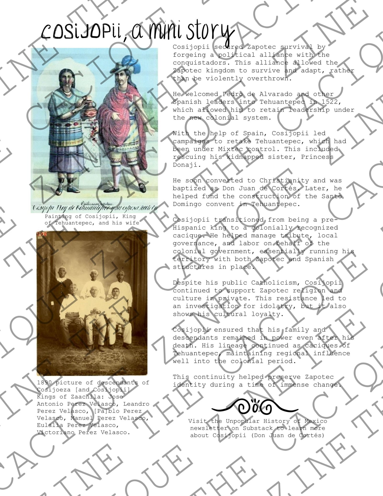 Step into the lesser-known story of Cosijopii, the last king of the Zapotec people and one of the many caciques (Indigenous leaders) who navigated power and survival, and even thrived during Spanish colonization. This zine is a printable, interactive deep dive into how native nobles like Cosijopii adapted to a rapidly changing world and how their choices helped shape the future of Oaxaca and beyond.