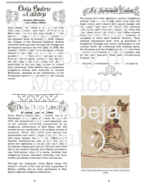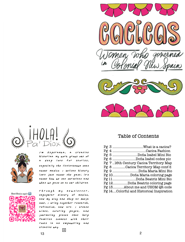 This handmade interactive zine introduces families to the powerful Indigenous women leaders of colonial Mexico. Through simple stories, activities, and coloring pages, you’ll discover who the cacicas were, what they wore, and how they led their communities during a time of big change.